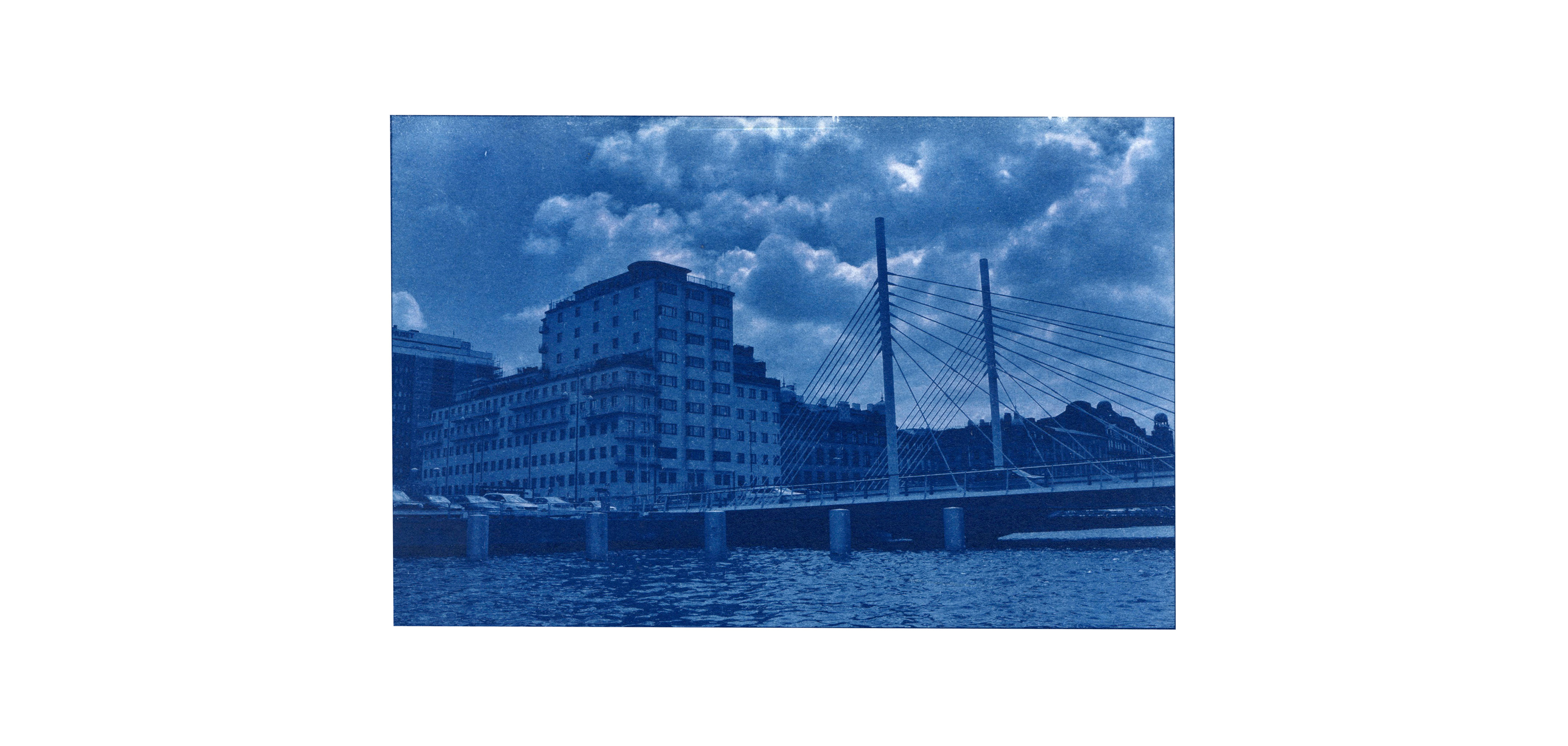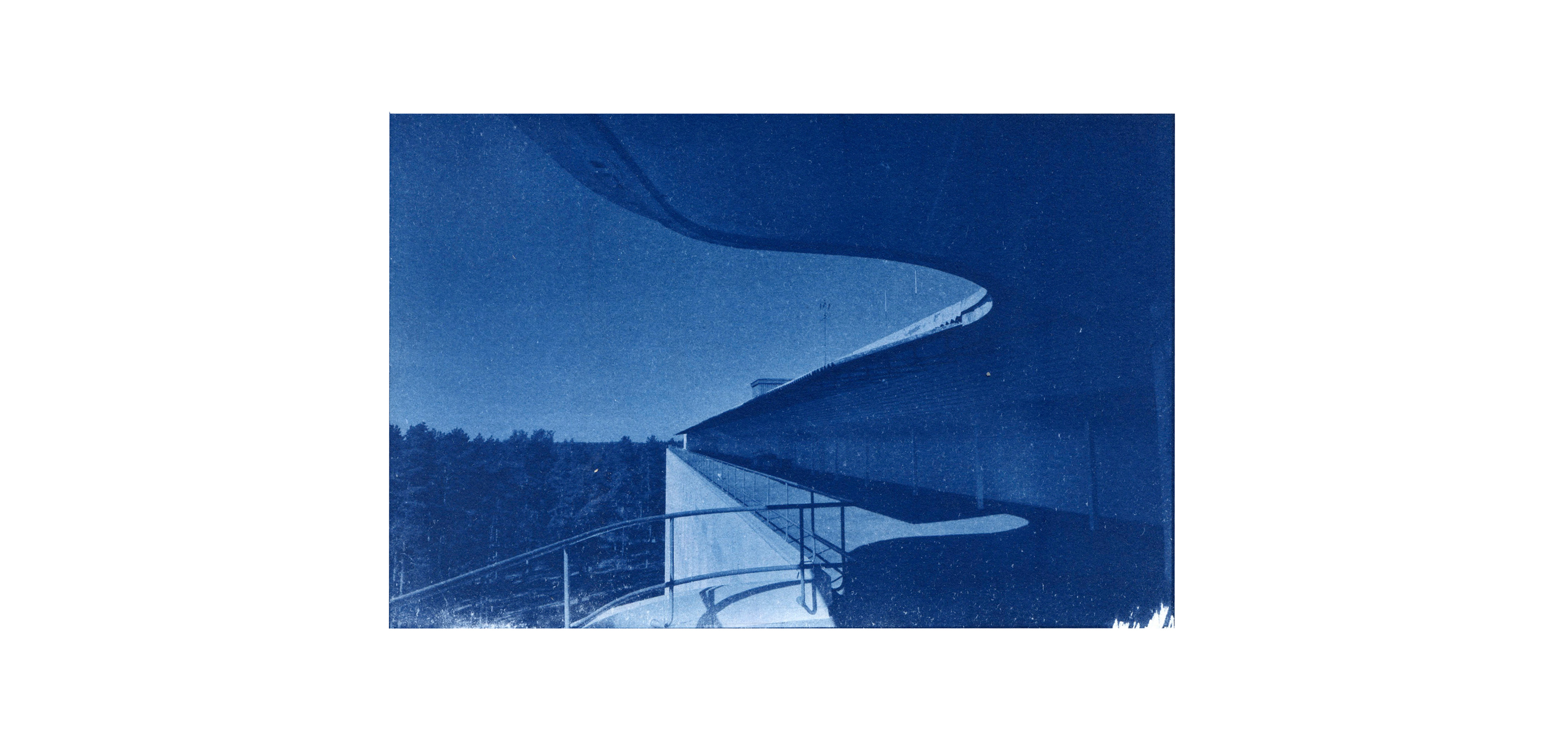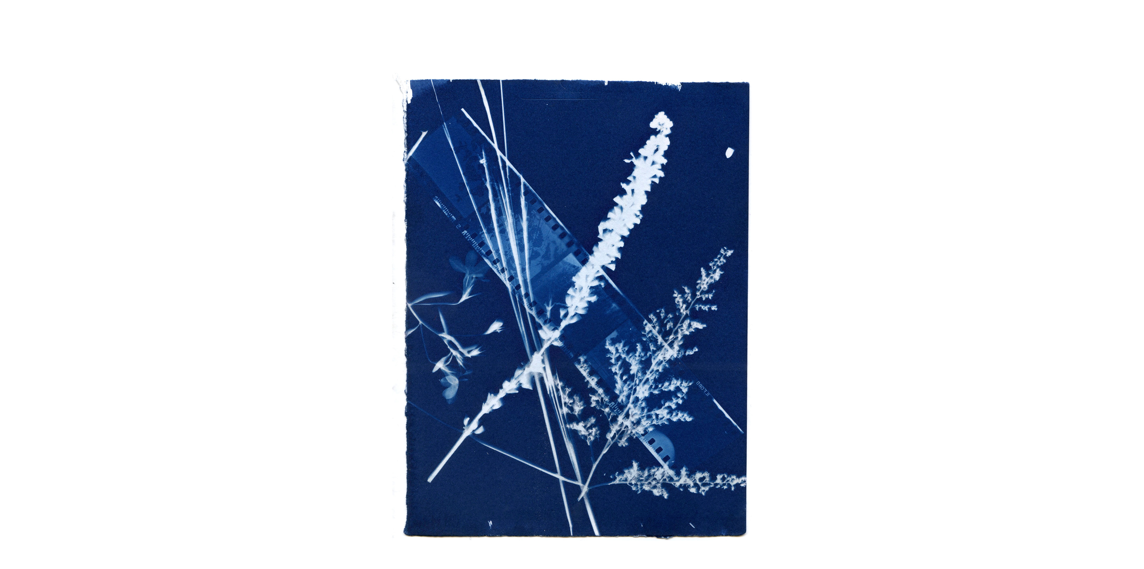 Experimental cyanotype prints contact printed in UV light box.