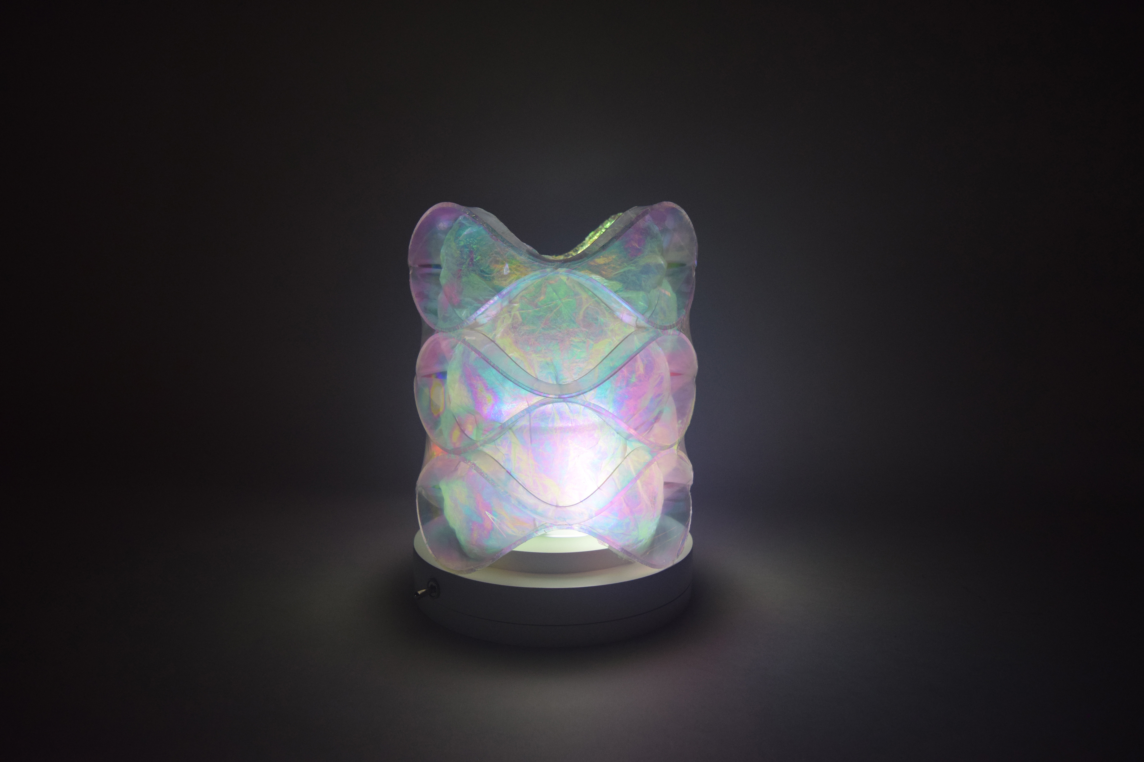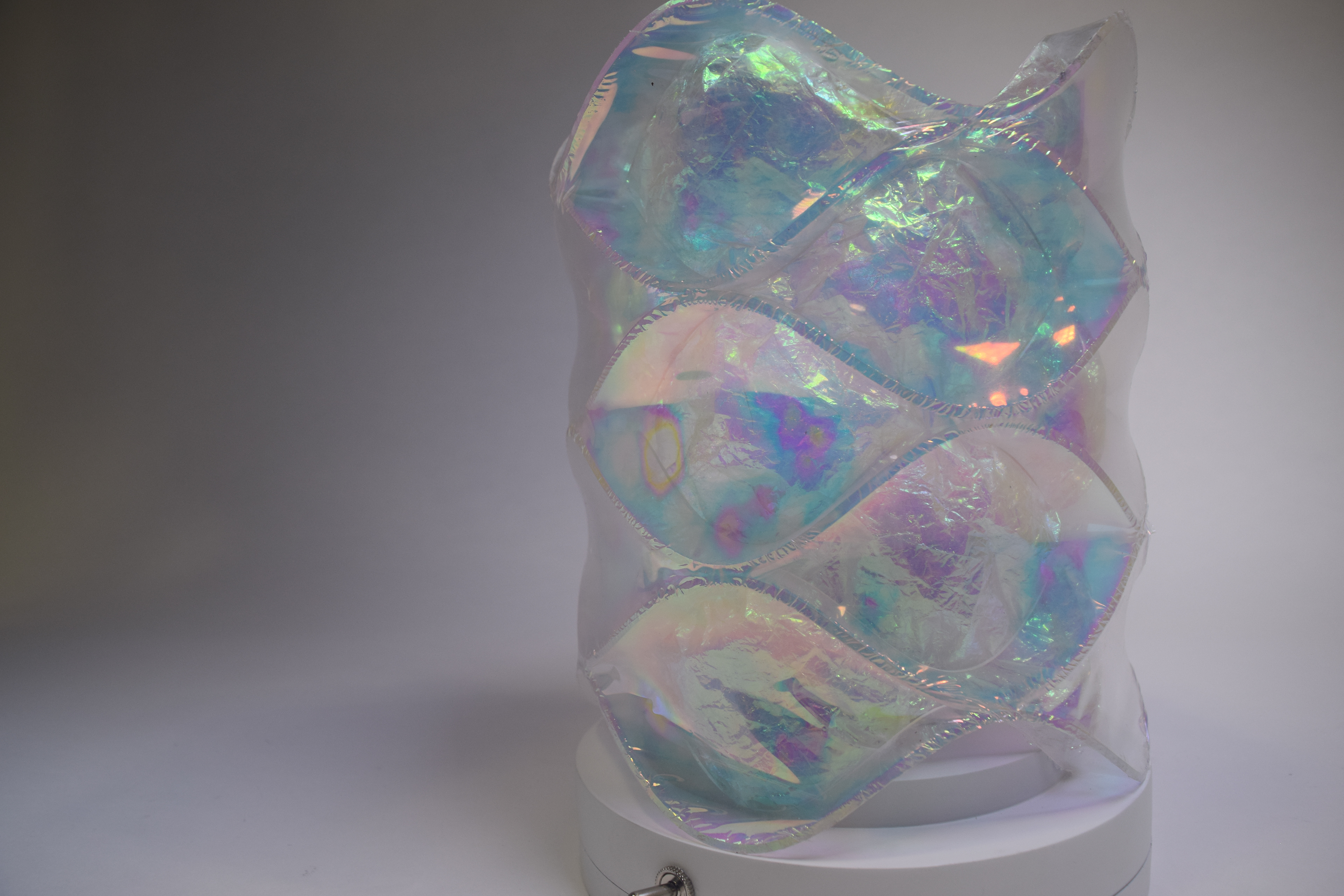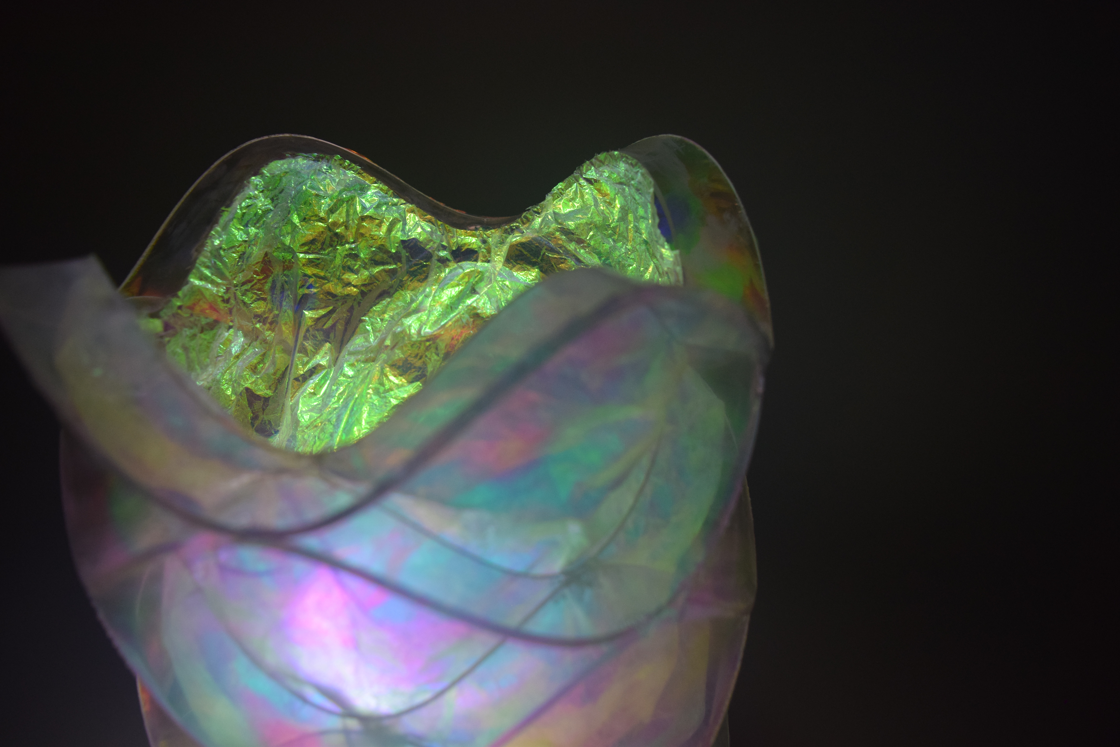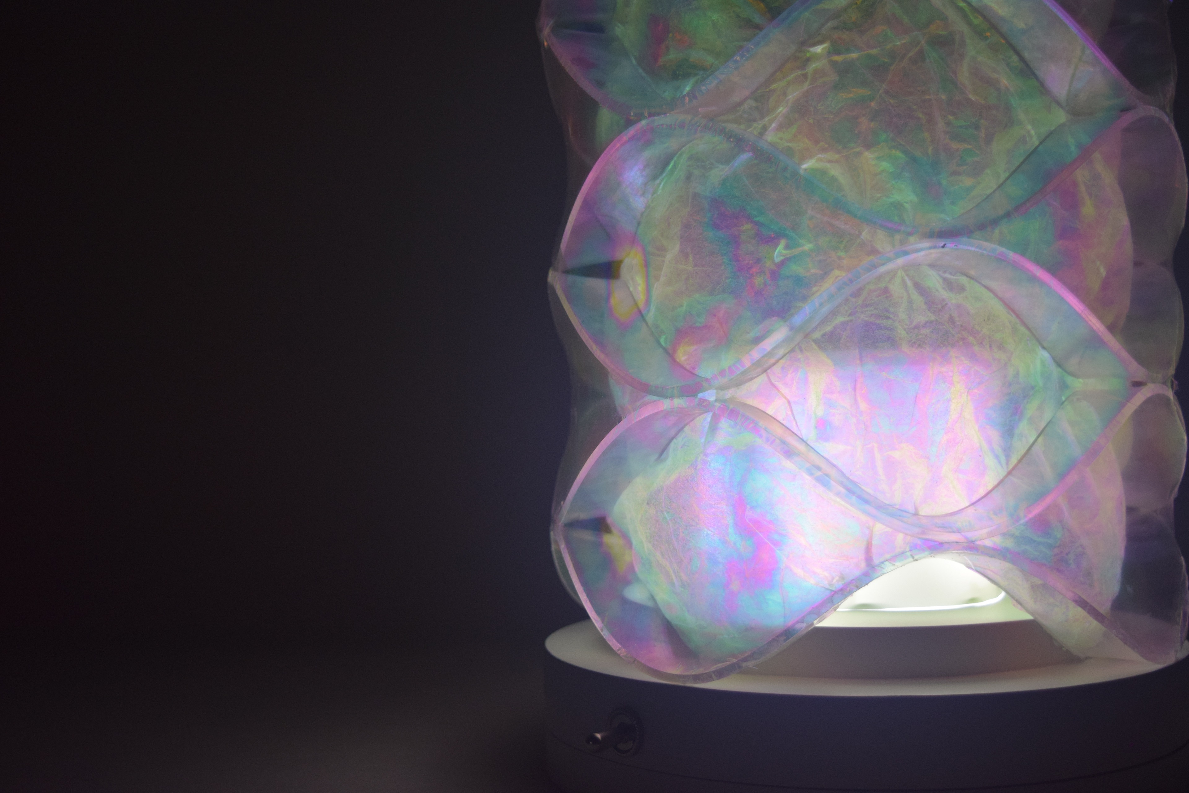 Opal mylar reflects light well and it is an easy material to manipulate, which is why it was perfect as the focal point of the luminaire. I did multiple rounds of prototyping so I could really understand how the light was working in my design. I tried thin metal sheets for the waves because the colors reflected really well off the metal but it did not provide enough structure. Instead, I heat bent acrylic into the wave pattern. The colors still reflected off the acrylic, but the material provided much more structure for the form and the light caused the edges of the acrylic to glow. The next step was figuring out how to attach the mylar in an effective way. From my exploration, I learned that the mylar film reacted to light differently when it was crinkled versus flat, and I wanted to play up this unique effect in my design. I shrink wrapped the mylar to the outside of the form and crinkled it on the inside.